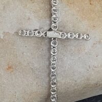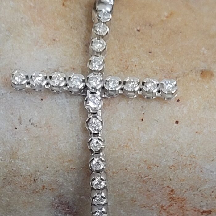 It is difficult to demonstrate in the images, but this cross has a fluid movement, which gives the Diamonds even more of a brilliant sparkle. It comes suspended from a 16″ White Gold spiga chain to complete your look.