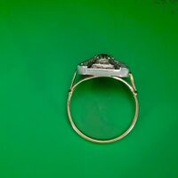 The head of the setting that surrounds the Emerald has a really striking Diamond-shape, and is set out in a mixture of different panels and is made from Silver. In classic Art-Deco inspired style, it is opulently embellished with a variety of bold Rose-cut Diamonds, all finished with a fine milgrain edging. The Yellow Gold ring setting has a striking open style to it that allows light to flood into the ring, further enhancing the characteritstics of the Rose-cut Diamonds. These gemstones have a total carat weight of 0.20cts.