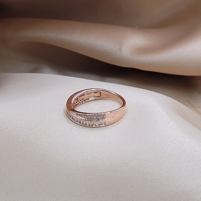 This ring is exquisitely crafted in rich, warm 9ct Rose Gold and features two rows of elongated baguette-cut Diamonds in a crossover style. The Diamonds are secured in a channel setting that extends halfway down the shank. Renowned for their stand-out brilliance and charm, these 0.50ct of Diamonds take centre stage as they are accentuated by the delicate Rose Gold setting that gracefully wraps around the finger. The way the warm Rose Gold compliments the cool, sparkling Diamonds creates the perfect harmonious and visually stunning combination!