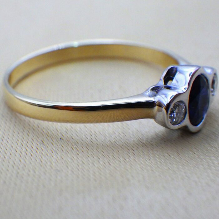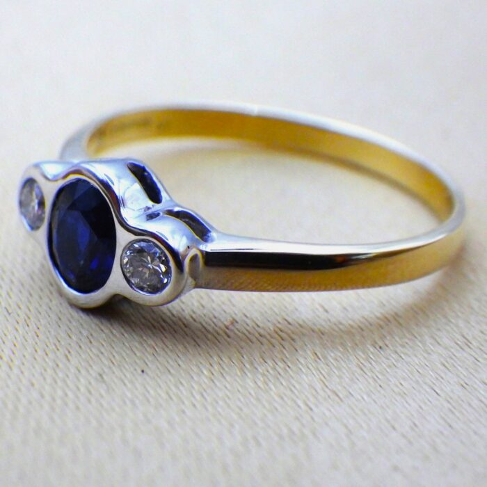 It is flanked by two beautiful round brilliant cut Diamonds with a bright, white sparkle that is beautifully complimented by the mesmerising deep blue Sapphire. The shank of the ring is made in rich 18ct Yellow Gold, with the head made from 18ct White Gold, giving this ring a striking and unique look. All the stones have been collet set, giving you the dual benefit of a securely set ring alongside a unique setting.