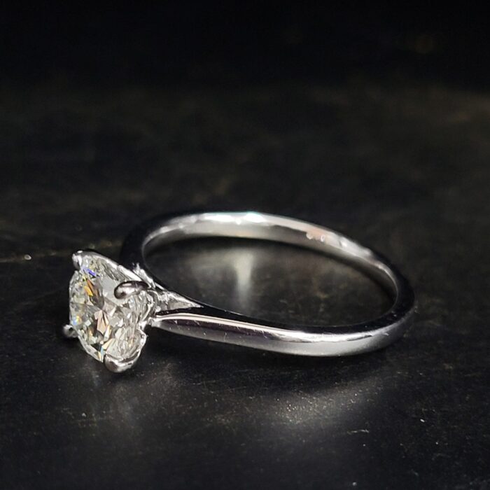This ring features a striking 1.03ct Diamond of exceptional quality. Securely set in a classic four-claw setting it is also set in a luxurious platinum band. It is beautifully cut to maximize the stone’s sparkle. With it’s H colour and VS1 clarity, this impressive 1.03ct Diamond really makes a bold and striking statement. It will capture attention and leaving a lasting impression for a lifetime.