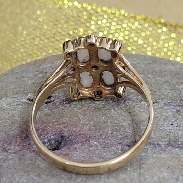 This ring has a split shank with delicate millgrain detailing, further add to its stylish silhoutte. The contrast of cool-toned Opals and warm Yellow Gold makes this striking ring a really flattering addition to your finger, with its gorgeous, eye-catching pops of colour.